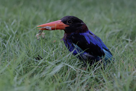 Grey Headed Kingfisher has a distinctive chestnut belly, sapphire blue tail and flight feathers, ashy-gray head and breast, and vermillion bill.