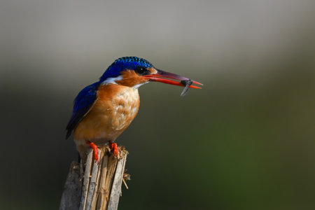 Malachite kingfisher crouches on post with grub