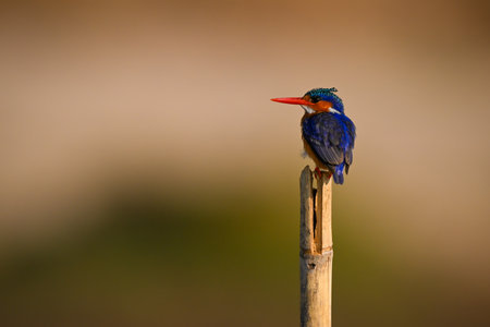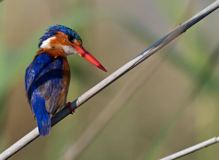 Closeup of a Malachite Kingfisher perched on a reed stem in a wetland of Botswana