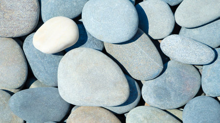 Small and big smooth round pebbles, sea dry stones, multicolour gray gravel. Abstract Composition Textured background. Ideal for web banner design