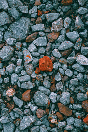 Closeup of small grey beige blue pink red broken crushed stones rocks lying on ground under rain. Natural environmental background texture. Garden rubble macadam top overhead view.