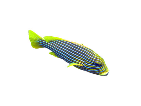 A colorful fish with blue and yellow stripes glides gracefully through clear waters, weaving amongst coral formations, showcasing the beauty of underwater marine life in its natural habitat..