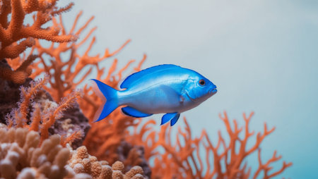 A striking blue fish is captured swimming near coral formations in an underwater environment. The image features a cool color palette with the fish's textured scales contrasting the soft, warm tones of the coral. This composition highlights natural beauty and is suitable for various commercial uses.