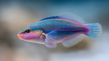 A beautiful wrasse fish with vibrant rainbow patterns swimming in an underwater paradise.