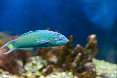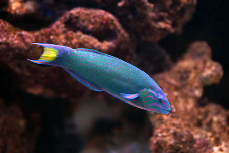 A moon wrasse, Thalassoma lunare, swimming in an aquarium