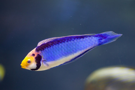 Small blue fish in the ocean, yellow, lonely, shiny, rocks