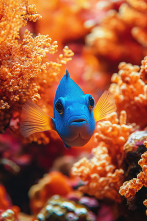 Striking blue fish navigates a vibrant orange coral reef, creating a captivating underwater scene