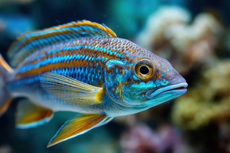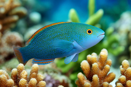 Turquoise wrasse with orange highlights swimming serenely near a vibrant coral reef, showcasing the beauty of underwater life