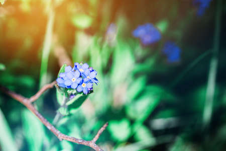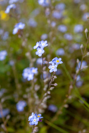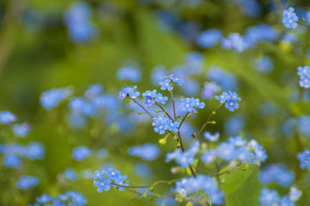 Beautiful forget-me-not (Myosotis scorpioides) flowers. Charming five-petaled blue blooms in spring. Flowering plants in the garden, flower bed. Native wildflowers in flowering garden. Plants care.