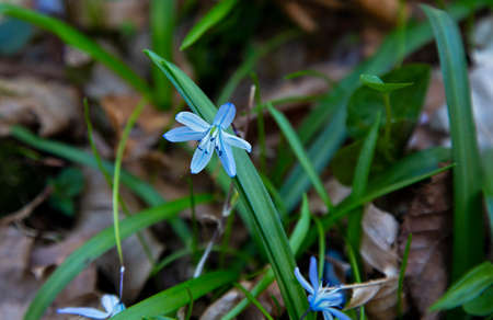 blue snowdrop, flowers in the forest on a background of dry leaves, close up