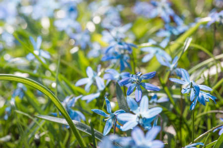 Blue blossom flowers spring snowdrops Scilla Squill Soft focus. nature background.