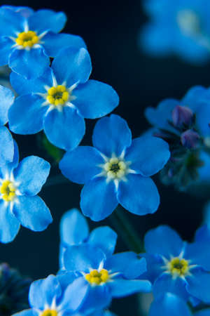 Little blue flowers Forget me not spring bouquet on dark background. Abstract floral backgrounds