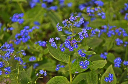 Incredibly beautiful blue flowers of Brunnera macrophylla (the Siberian bugloss, great forget-me-not, largeleaf brunnera or heartleaf) are growing in the green grass field.