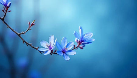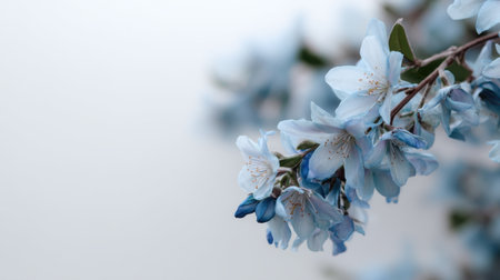 A close-up view of a delicate light blue blossom branch, featuring soft petals against a light background. This serene floral image evokes tranquility and beauty.
