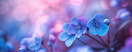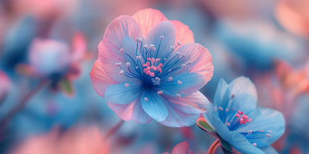 Close-up of blue and pink flowers with bokeh background, macro photography. Nature and beauty concept