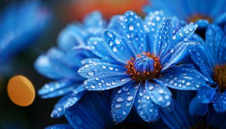 Blue daisy flowers with drops of dew on petals.