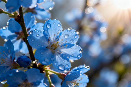 Beautiful blue flowers of cherry blossoms with dew drops close-up