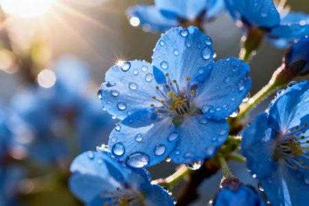 This captivating image showcases vibrant blue flowers adorned with dewdrops, set against a softly blurred background, highlighting tranquility and natural beauty.