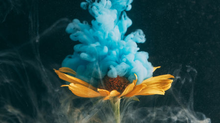 Nature paint. Cloud ink. Defocused blue color water texture yellow green lily flower plant on abstract dark black creative background.
