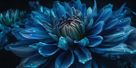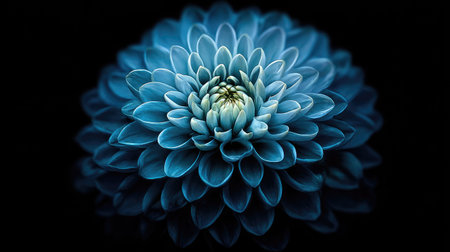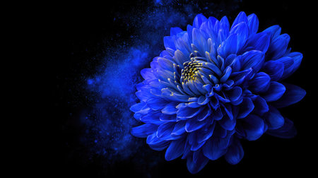 A close-up view displays a striking blue chrysanthemum flower against a deep black backdrop. The petals exhibit a layered texture, with subtle shading adding depth. The composition focuses on the flower, highlighting its intricate form. This image could be used for various design projects or editorial purposes.