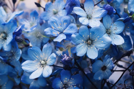 A close up of a bunch of blue flowers with small white dots, AI