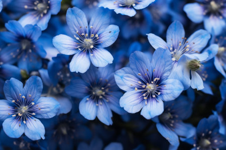 Explore a stunning close-up of delicate blue flowers adorned with vibrant yellow centers, bathed in soft sunlight, creating a serene and inviting atmosphere for nature enthusiasts.