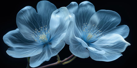 This image presents a stunning close-up of a blue flower, showcasing numerous delicate petals. The flower is set against a stark black backdrop, creating a high-contrast effect that emphasizes its texture and form. The lighting highlights the intricate details, making it suitable for decorative, commercial, or editorial purposes.