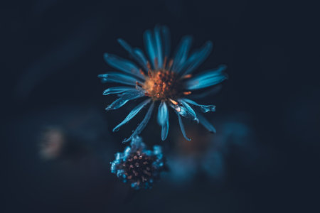 chrysanthemum buds captured in ultraviolet photography with focus stacking technique. the uhd image showcases soft blue hues and fluid lines, creating a romantic scene that's hard to believe. ai generated