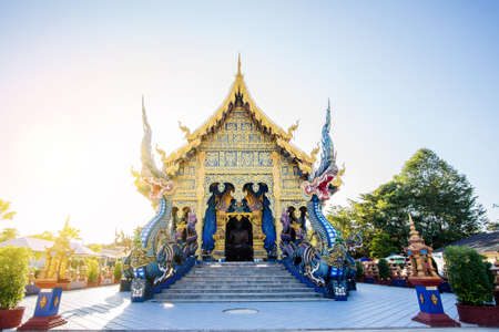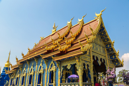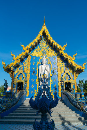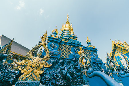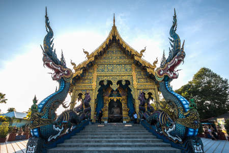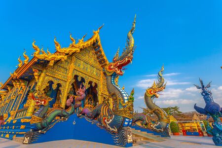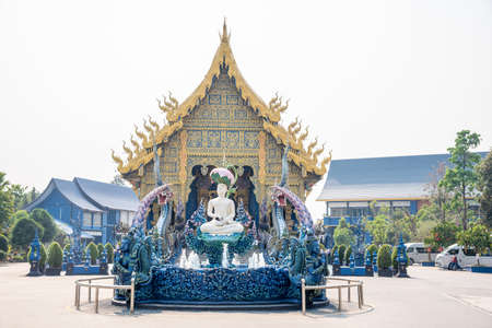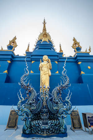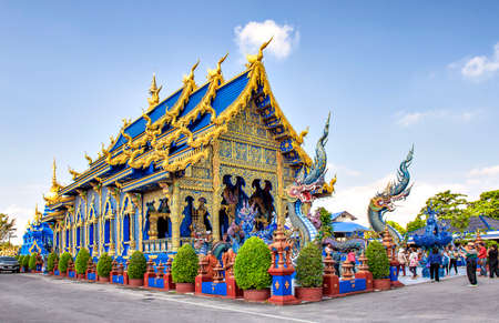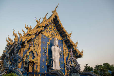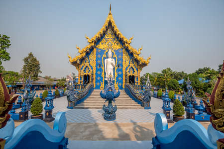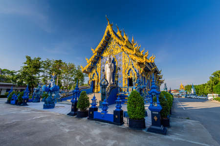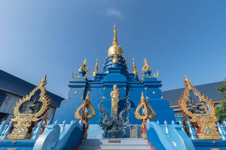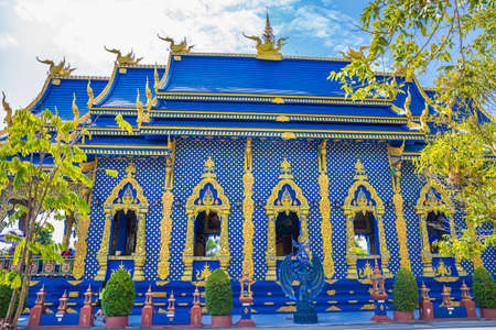 Rimkok district,Chiang Rai Province,Northern Thailand on January 19,2020:Beautiful cobalt blue and gold facade of the main hall of Wat Rong Suea Ten or Blue Temple.