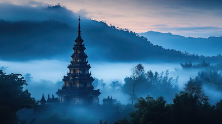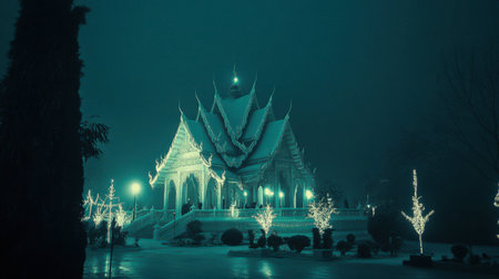 A beautifully illuminated temple emerges through a foggy night, surrounded by glowing lights and serene nature, creating a tranquil and enchanting atmosphere.
