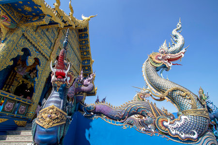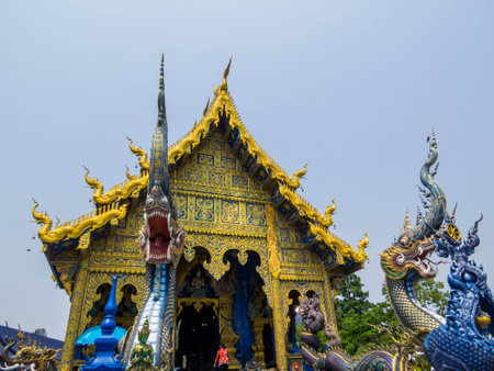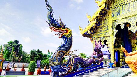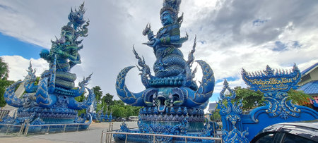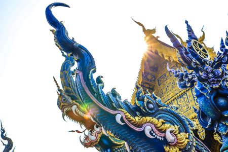 Chiang Rai, Thailand - Sep 05, 2020 : Elaborate sculptures of Buddhist church at the famous Wat Rong Suea Ten Temple (Blue Temple) in Chiang rai, Thailand. Selective Focus.