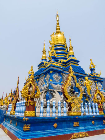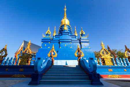 Blue temple at Chiang Rai, Thailand, or Wat Rong Suea Ten in Thai. This temple hosts many Buddhist ornaments painted in all blue and gold colors. Behind the temple is Buddhist pago