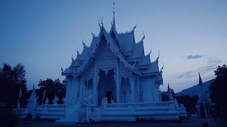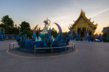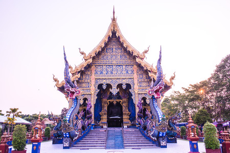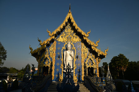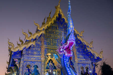 Chiang Rai, Thailand - 25 July 2020: Beauty of Blue Temple or Rong Suea Temple at dusk. Chiang Rai Province, Thailand