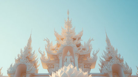 Stunning view of a majestic white temple set against a serene sky, showcasing intricate architectural details and a tranquil atmosphere, perfect for travel and cultural themes.