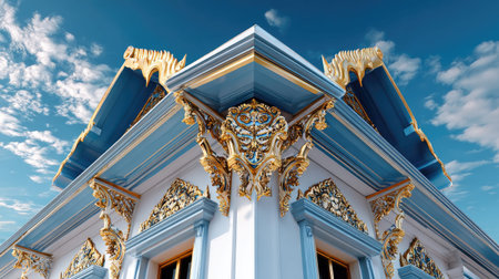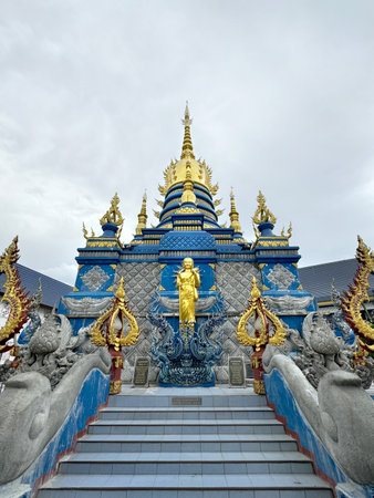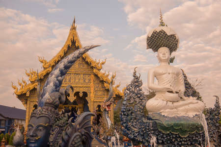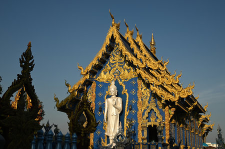 Chiang Rai, Thailand - Sep 05, 2020 : Elaborate sculptures of Golden Buddha image at the famous Wat Rong Suea Ten (Blue Temple) in Chiang rai, Thailand. Selective Focus.