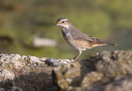 Bluethroat (Luscinia svecica) beautiful brown bird with blue and orange color on chest to chin standing on a dirt rock over green background in low lighting condition with front feathers profile, exotic nature
