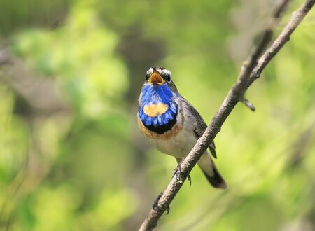 a bright beautiful male Bluethroat bird sitting on a branch and sings a song in may the garden on a Sunny day