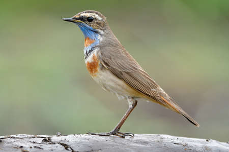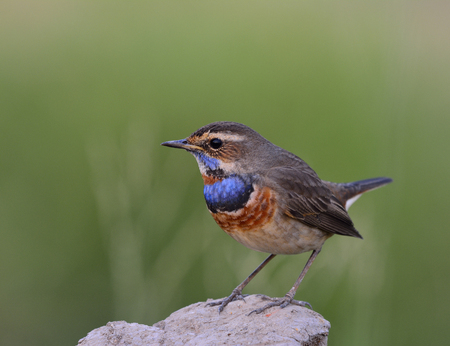 Really beautiful slim bird standing on clean soil pole over fine green background, bluethroat