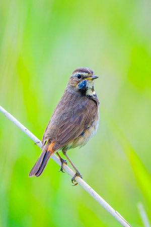 Little bluethroat songbird in summer green grass