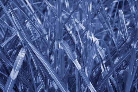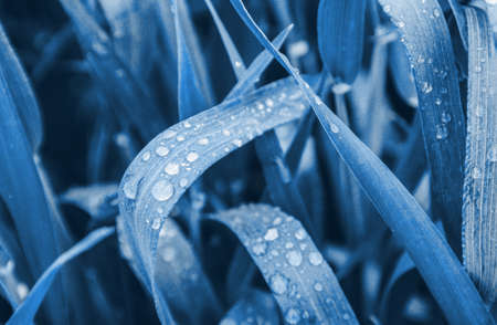 Morning grass with dew drops in a trendy blue tone. Colorful background.
