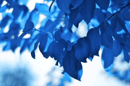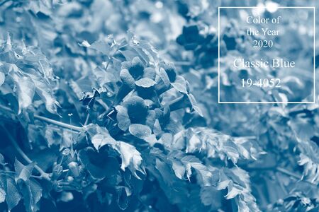 Closeup textured foliage toned in Classic Blue - color of the year 2020. Natural background with place for text.