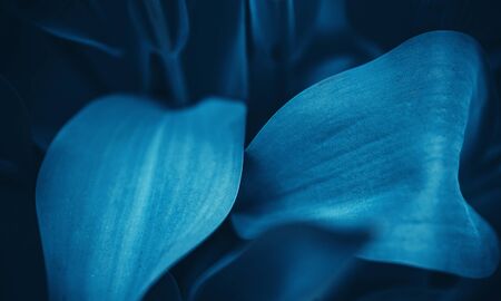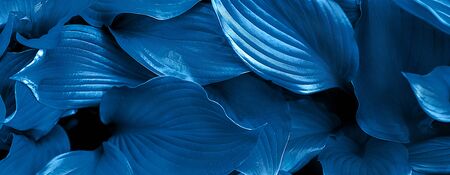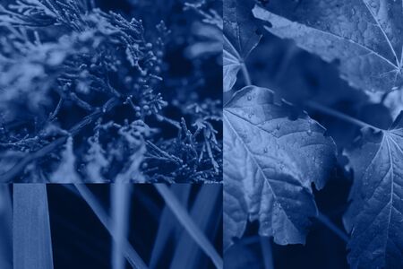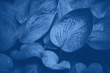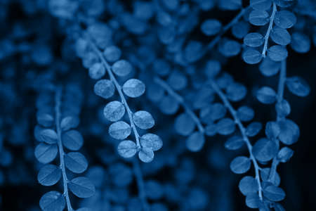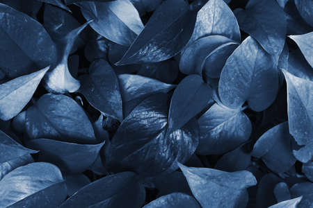 Closeup textured foliage toned in Classic Blue - color of the year 2020. Natural background with place for text.