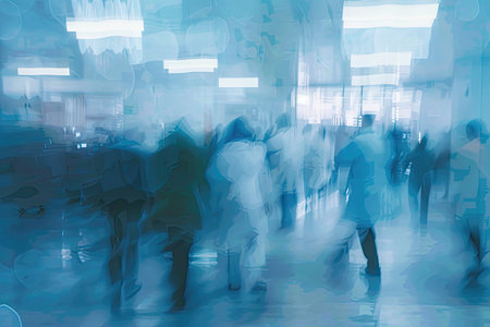Winter city commuters with snow. Blurred image of people walking on the street. back home after work. Defocused figures of people with snowing effect and frost.