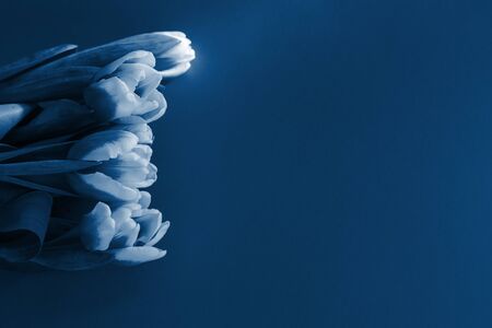Bouquet of tulips flat lay on toned in Classic Blue color of the year 2020 in the sunshine. Close-up, shallow depth of field, copy space