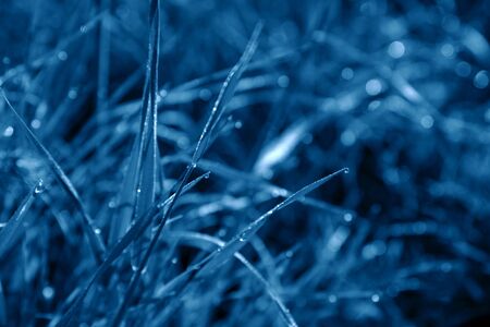 Morning grass with dew drops in a trendy blue tone. Colorful background.