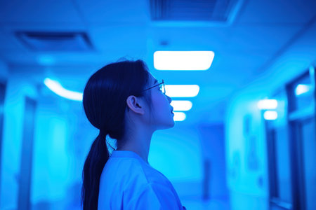 A medical worker stands in a blue-lit hallway, looking up thoughtfully during a quiet night shift.