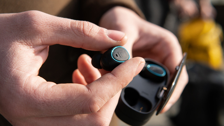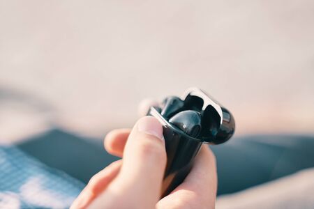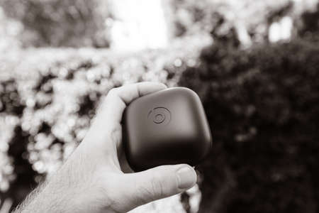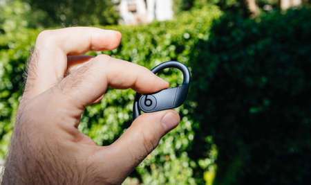 Paris, France - Jun 17, 2019: Close-up of man fingers holding new Powerbeats Pro Beats by Dr Dre wireless high-performance earphone with integrated Siri - green park forest background