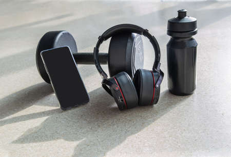 Composition of Smartphone, Headphones and Dumbbell for Listening to music while exercising. Copy space, Selective focus.