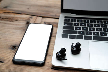 phone with white screen laptop and wireless headphones on wooden table, technology