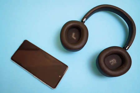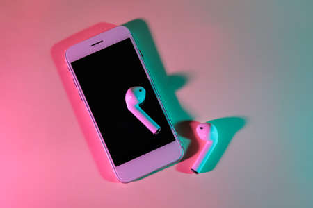 Headphones with smartphone mock up. Sound audio headphones on a colored neon background with a blank smartphone screen. Music app, listening to podcasts and audiobooks concept.